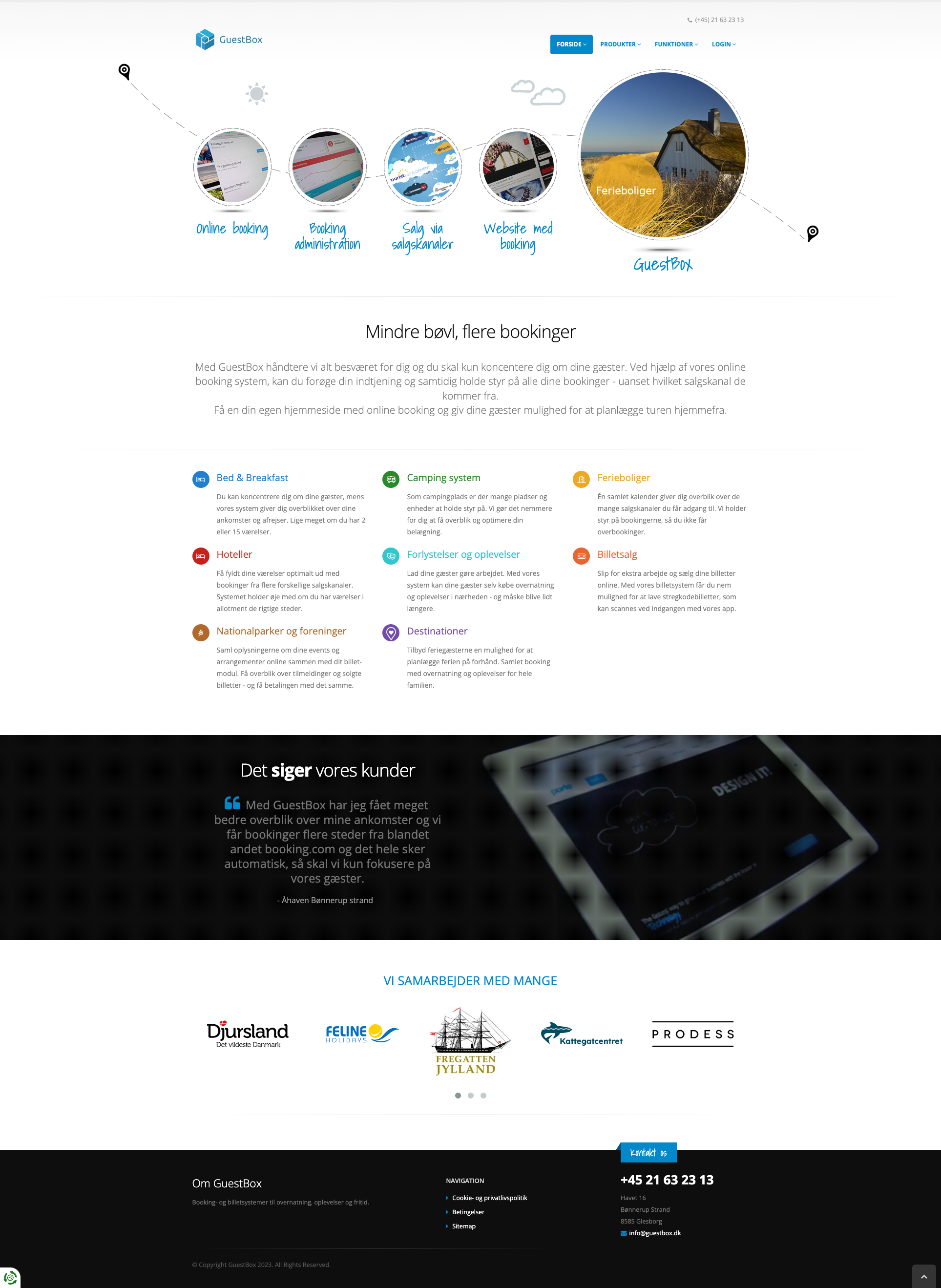 Med GuestBox håndtere vi meget af besværet for dig, så du kan koncentere dig om dine gæster. Ved hjælp af vores online booking system, kan du forøge din indtjening og samtidig holde styr på alle dine bookinger - uanset hvilket salgskanal de kommer fra. Få en din egen hjemmeside med online booking og giv dine gæster mulighed for at planlægge turen hjemmefra.